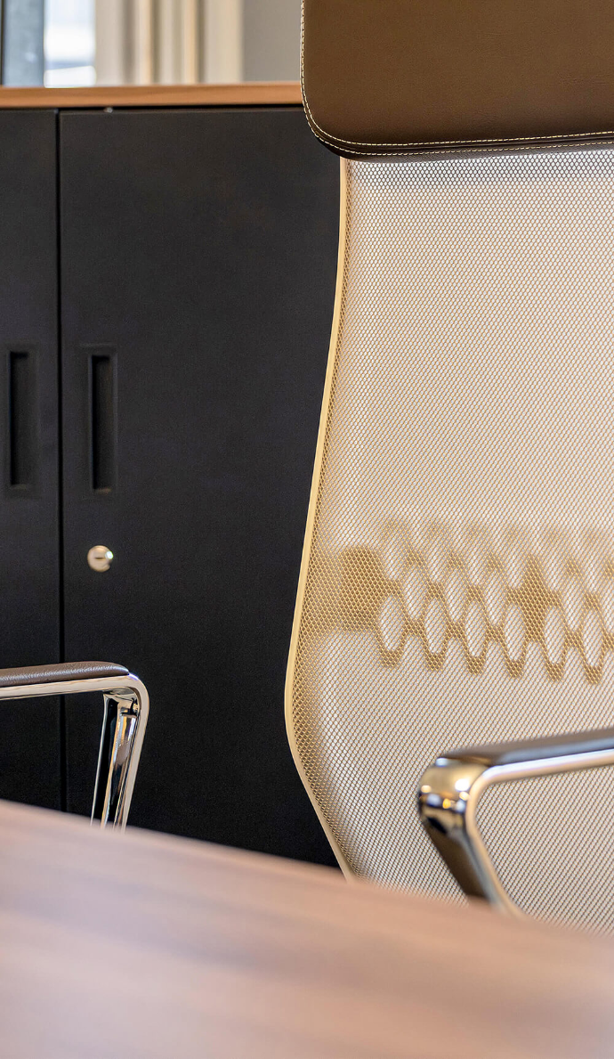 Stühle: Ergonomische Bürostühle passen sich dem Körper an, unterstützen die Wirbelsäule und entlasten Rücken und Nacken. So bleibt das Team auch bei langen Arbeitstagen leistungsfähig.